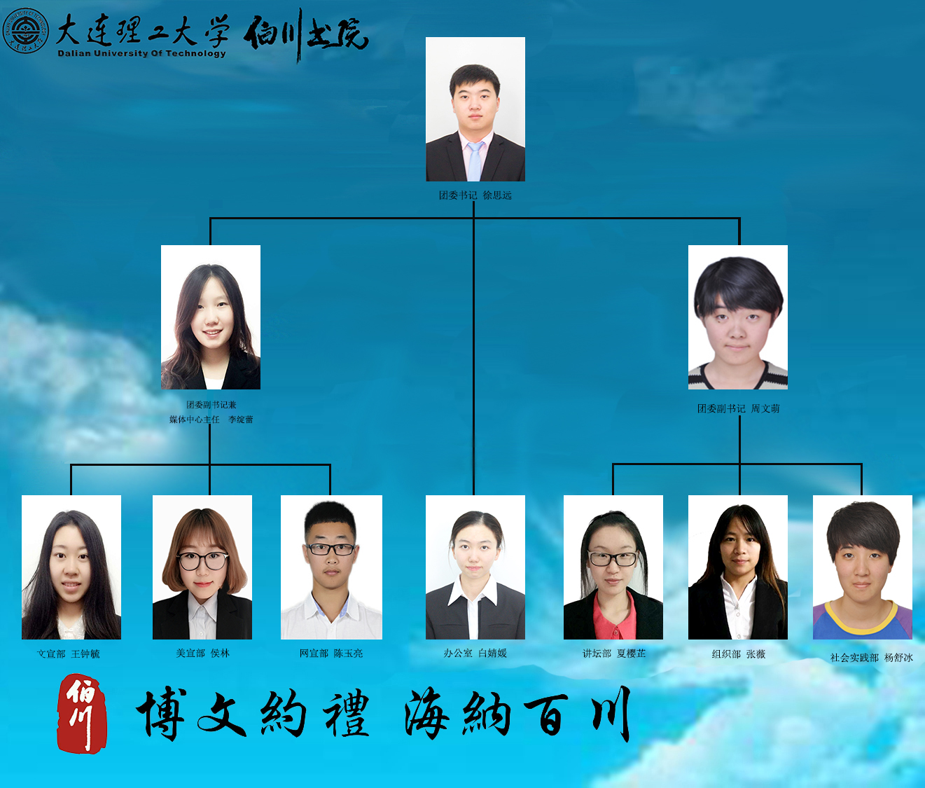 伯川书院团委下设7个部门,分别为组织部、社会实践部、讲坛部、办公室,媒体中心(文宣部、美宣部、网宣部)。